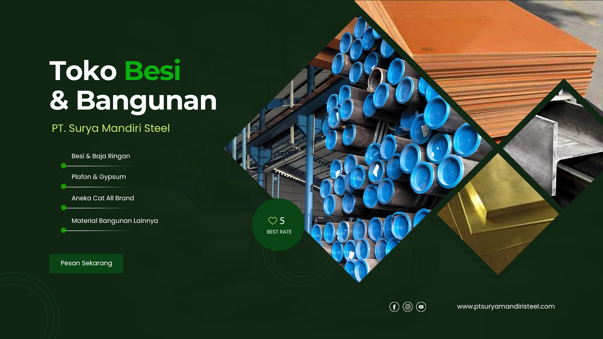 PT. Surya Mandiri Steel berkomitmen untuk menjadi mitra yang dapat diandalkan dalam industri besi, baja, dan material bangunan. Kami selalu berusaha memberikan produk berkualitas tinggi dengan layanan terbaik demi kepuasan pelanggan.